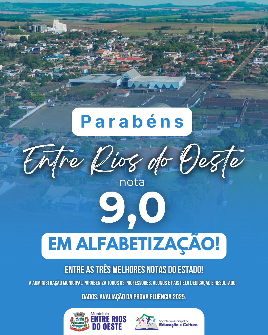O Município de Entre Rios do Oeste celebra um resultado histórico na Prova Fluência 2025, alcançando a expressiva nota 9,0, um índice que reforça o compromisso da rede municipal com a alfabetização na idade certa.